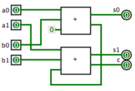 Pour additionner deux nombres binaires {$a=a_1a_0$} et {$b=b_1b_0$}, on procède comme vous l'avez toujours fait en base 10, à la différence que la table d'addition en base 2 est particulièrement simple. On calcule la somme et la retenue de {$a_0+b_0$}, puis la somme et la retenue de {$a_1+b_1$} en prenant en compte la retenue précédente. Ceci se fait simplement en cascadant deux additionneurs :