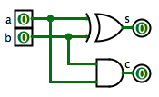 On constate que la somme {$s$} est nulle quand les deux bits sont égaux, et égale à 1 quand ils sont différents. On a donc {$s = a\oplus b$}. La retenue vaut 1 quand les deux bits valent 1, donc {$c = a\wedge b$}. Il est donc possible de calculer la somme de deux bits et la retenue avec des portes logiques. Le circuit correspondant est appelé demi-additionneur :